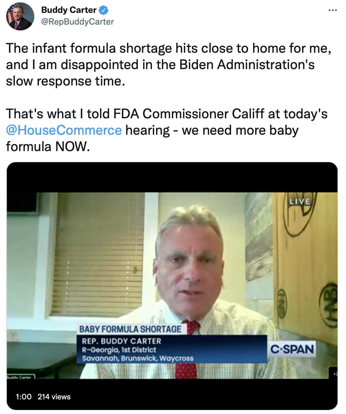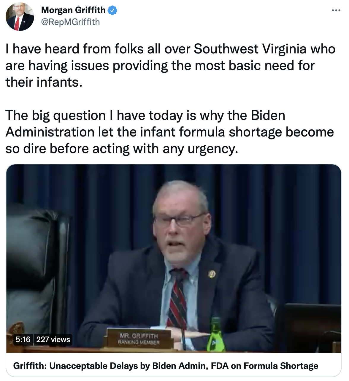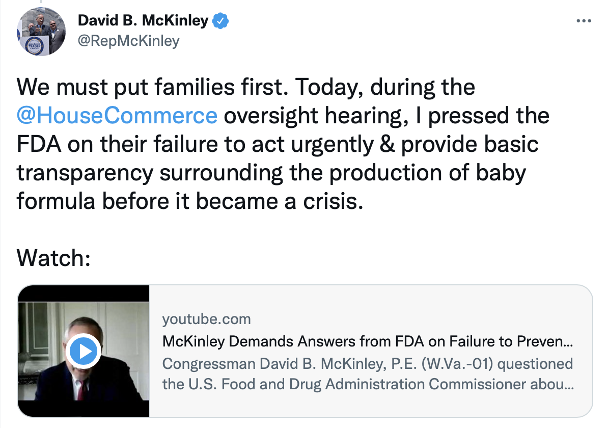 Today’s Oversight and Investigations Subcommittee hearing made clear the Biden administration’s failure to quickly act on the baby formula crisis. There should have been a plan before the Abbott plant closed.