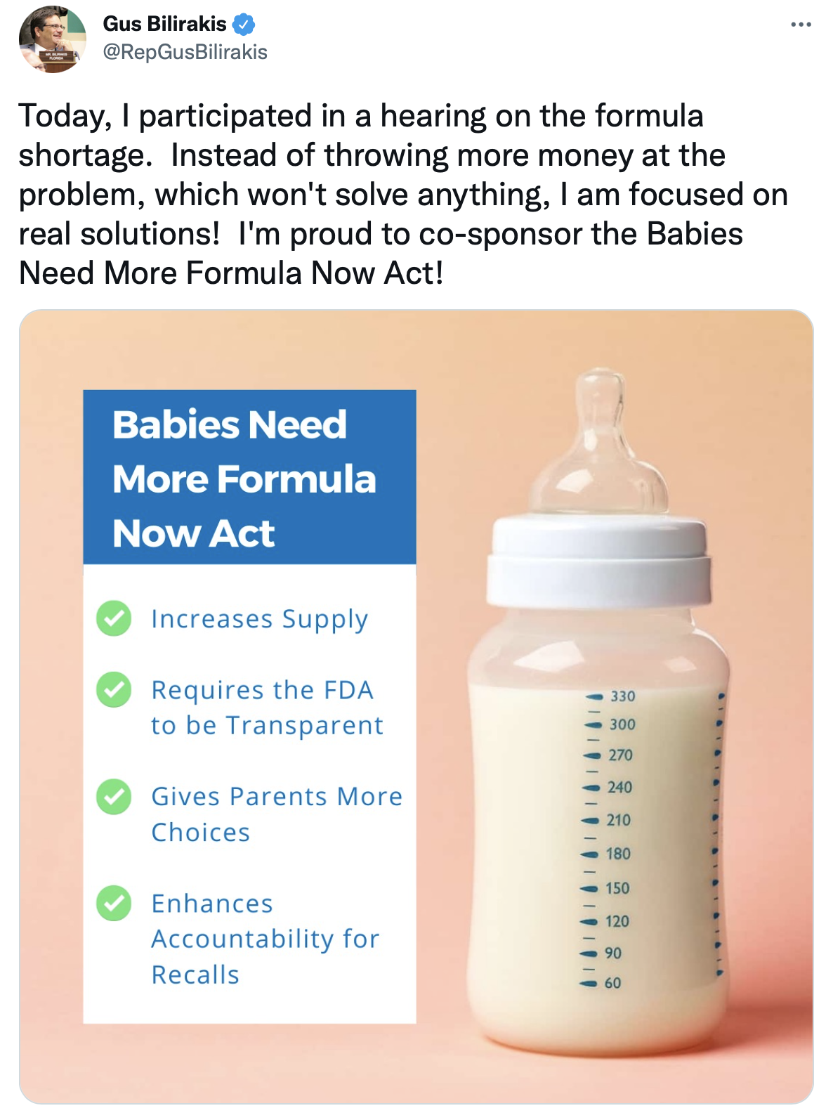 In addition to addressing the immediate crisis parents and babies face, this legislation also requires more oversight and accountability over FDA to ensure the Biden administration is doing its job, acting quickly to maintain a healthy and safe supply of formula, and not wasting resources. To ensure parents have more choices in the future, it also reduces barriers to innovation for new brands and types of formula to enter the marketplace.